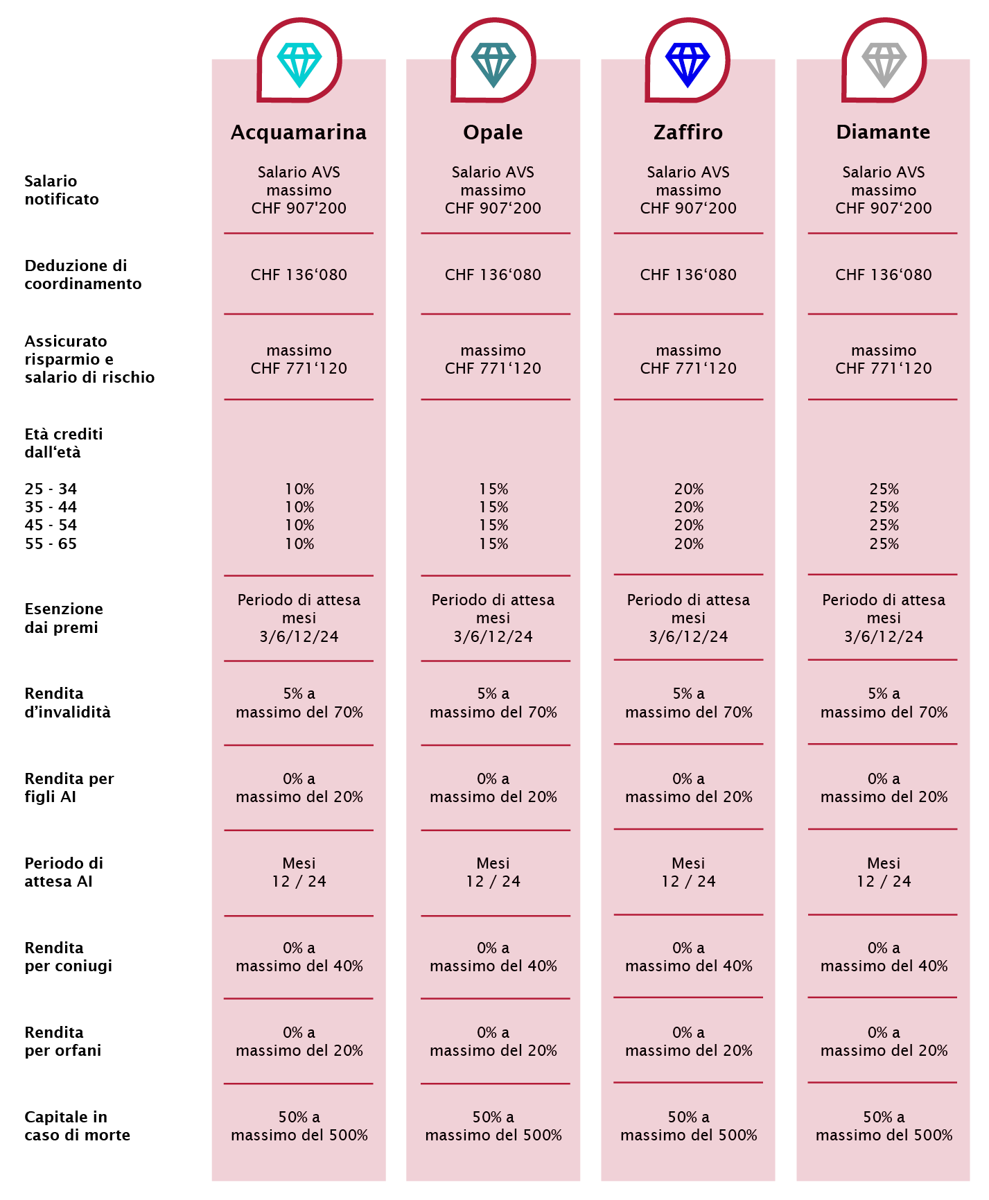 I membri possono accedere a chiare soluzioni di previdenza per coprire i rischi derivanti da vecchiaia, decesso e invalidità. L’Associazione intende offrire ai propri membri soluzioni di previdenza moderne e all’avanguardia, con interessanti premi di rischio.